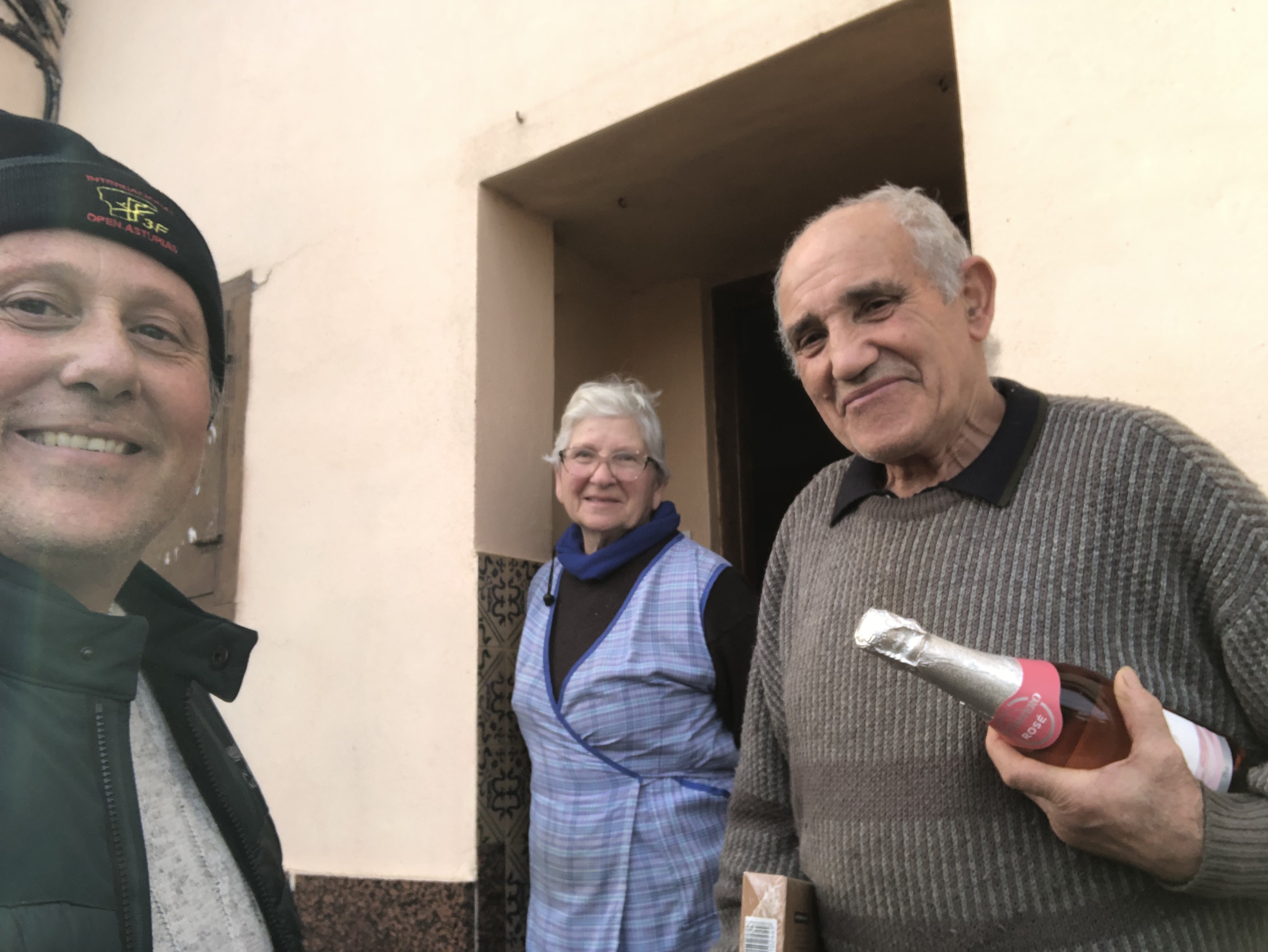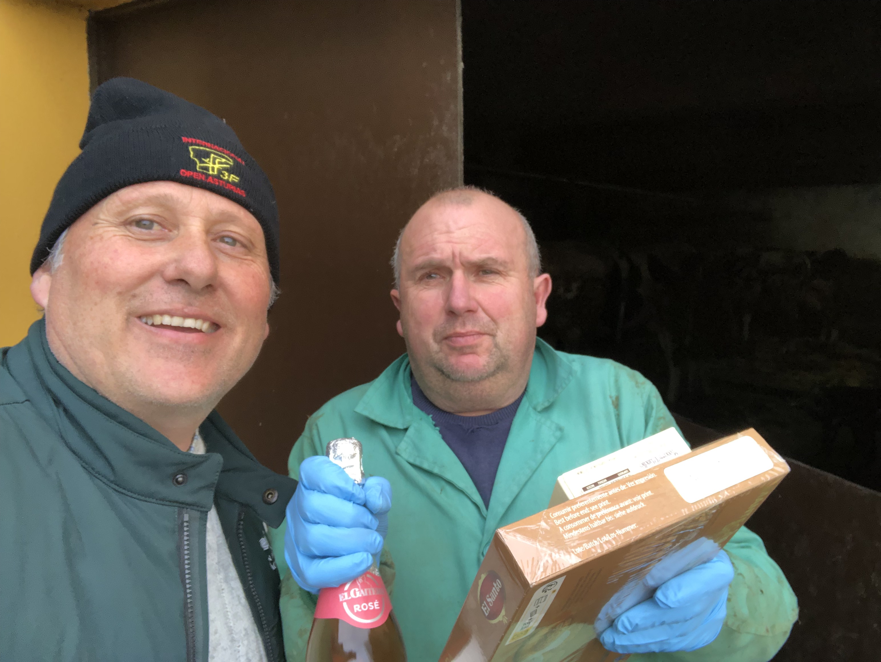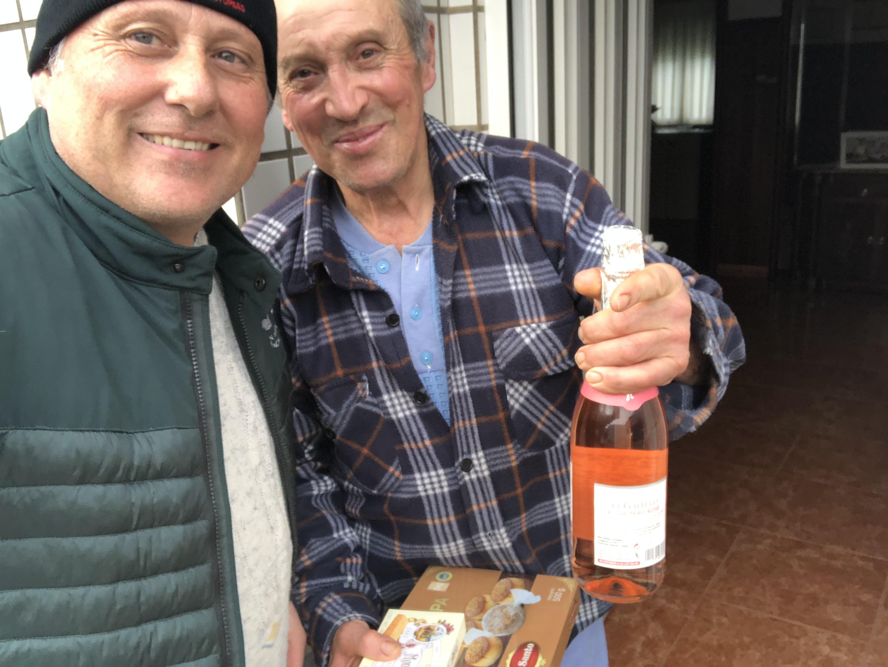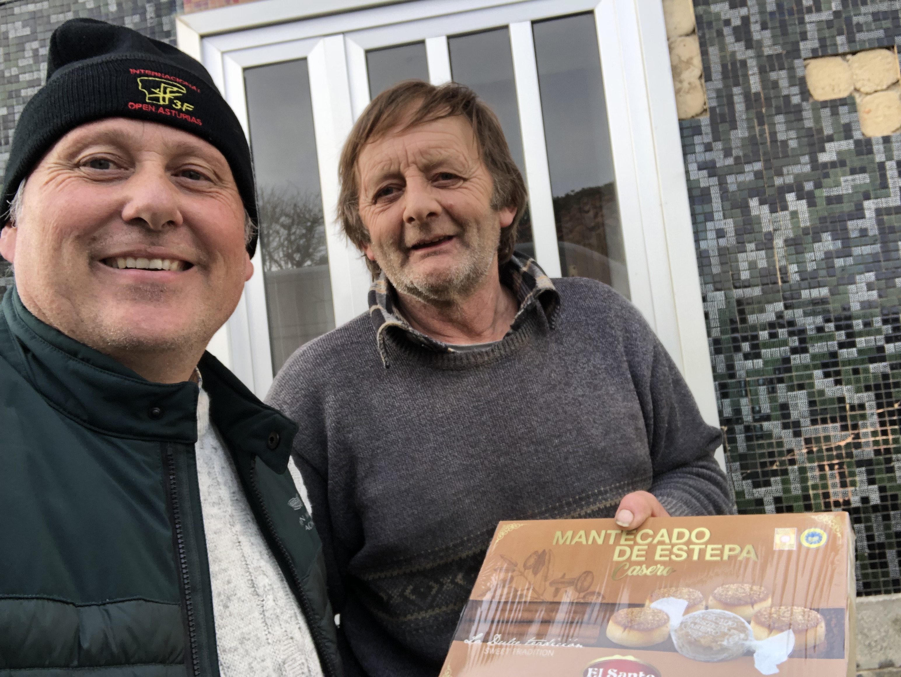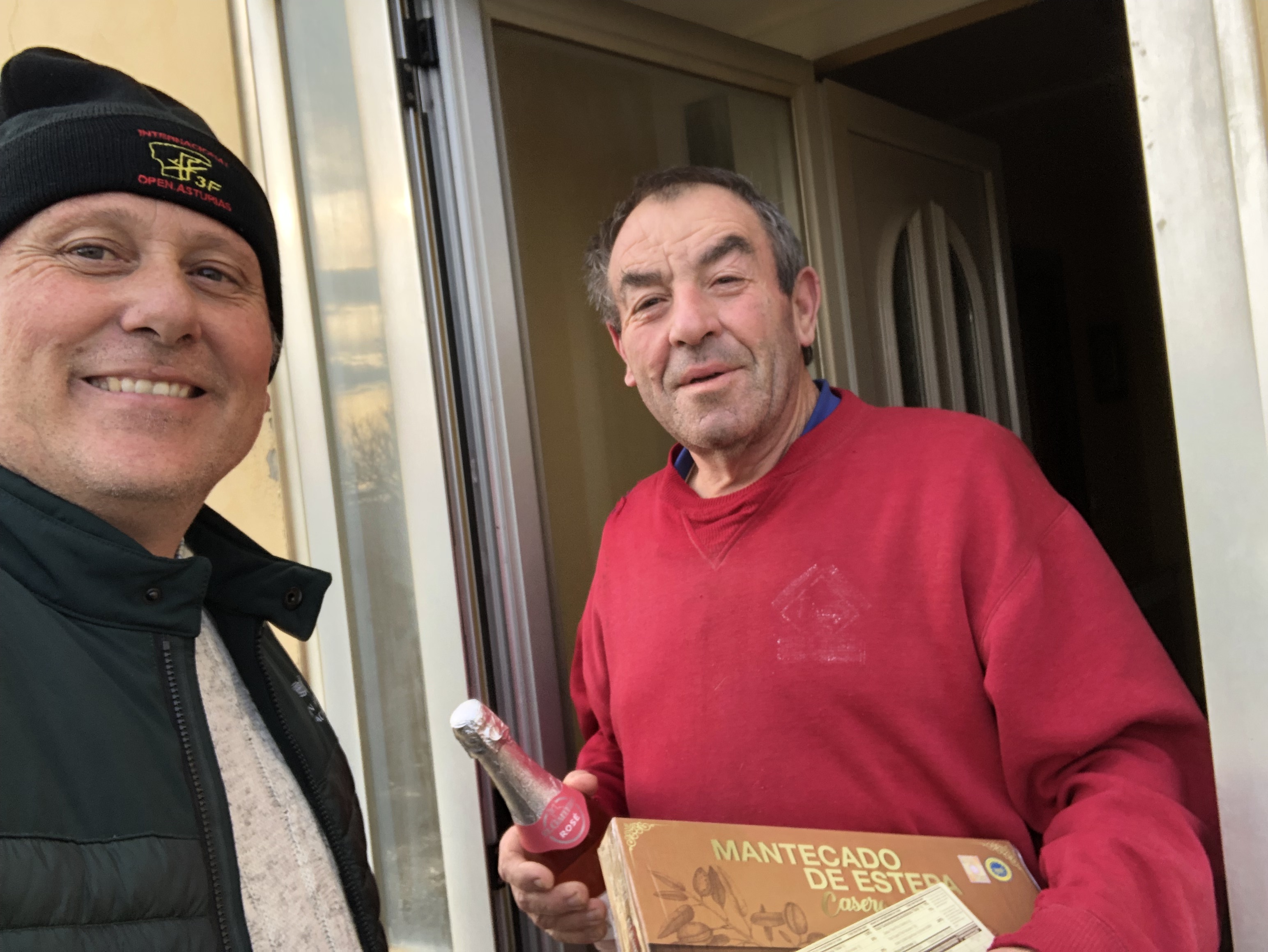 Y Félix, repartió los regalos de navidad a los 5 propietarios de las fincas de Ferrero. Este año se entregó: Botella de sidra espumosa Rose del Gaitero, Caja de mantecados y tableta de turrón.